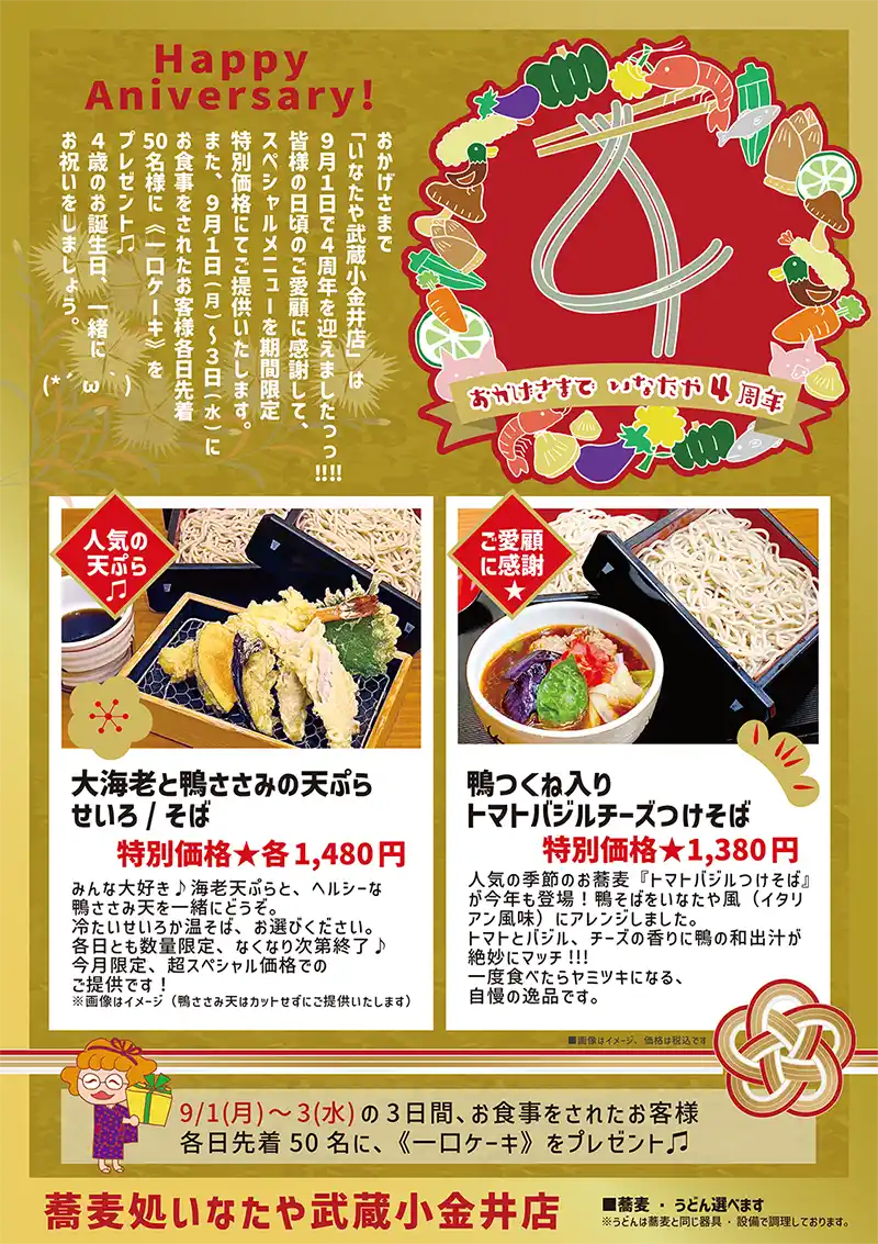 【予告】おかげさまで「いなたや武蔵小金井店」は9月1日で4周年を迎えました!!!
