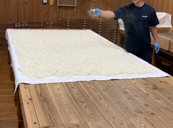 蒸米に麹菌を振り、時間が経って固まった米を